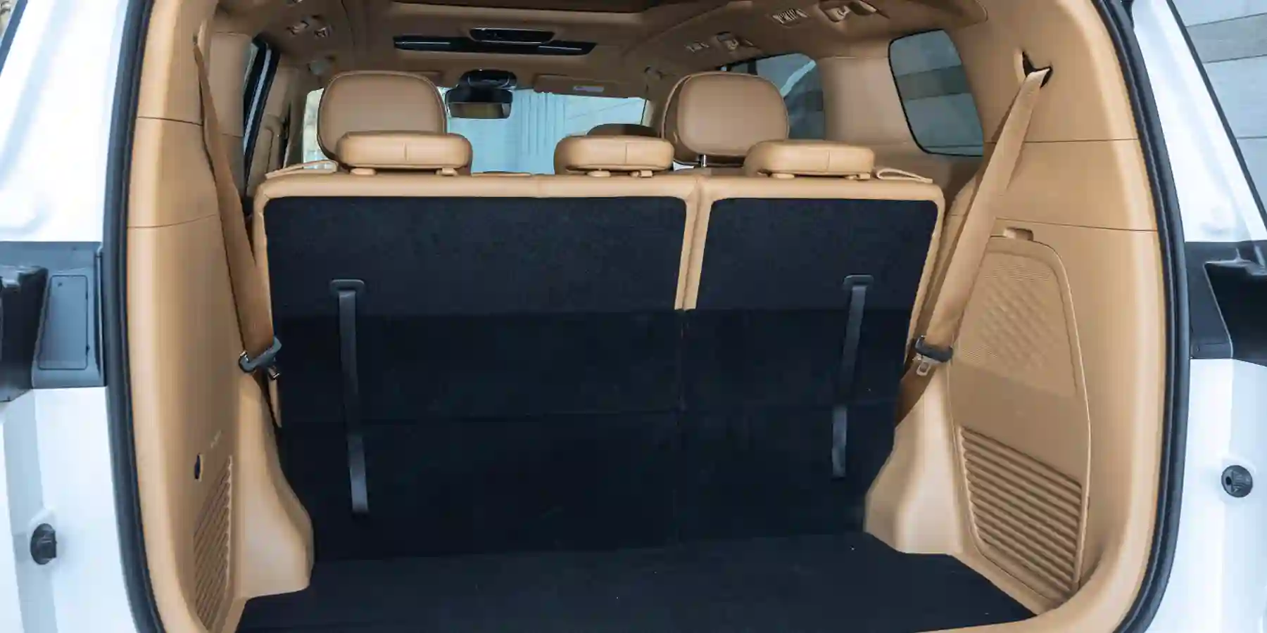 Второй ряд — это два отдельных кресла с оттоманками, подогревом, вентиляцией и даже массажем (все режимы включаются физическими кнопками). Для всех направлений предусмотрены электрорегулировки за исключением продольного. Двигать сиденья вперед-назад придется вручную, что не так уж и просто, потому что они тяжеленные. Полностью откинуть спинки тоже нельзя, и забраться на третий ряд можно только протиснувшись посередине, между креслами второго ряда, пригнувшись и задевая ногами за подлокотники.